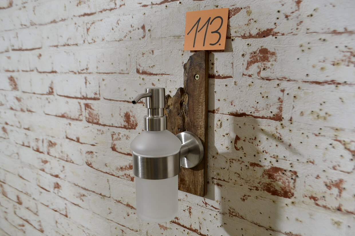 Das Holz der Badgarnituren kann Unebenheiten, Einkerbungen, ehemalige Wurmlöcher und Splintholz (Weißholz) aufweisen.