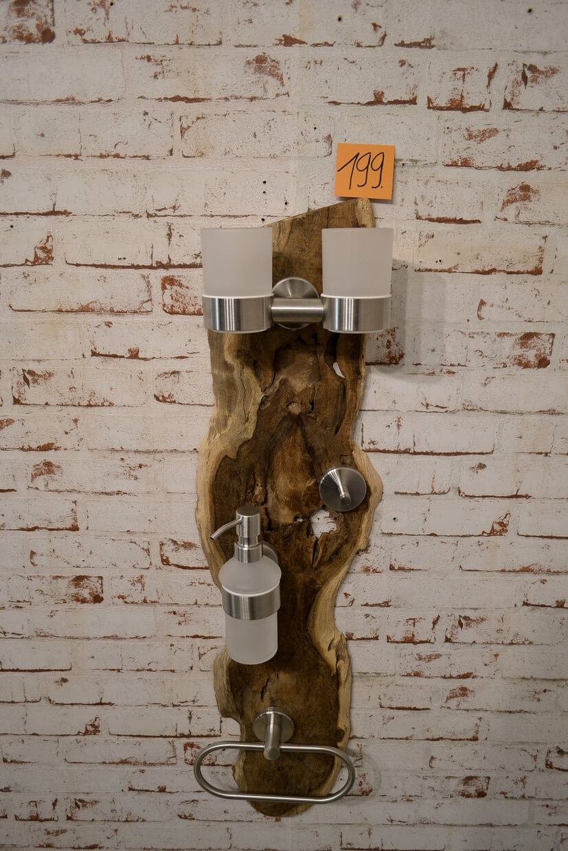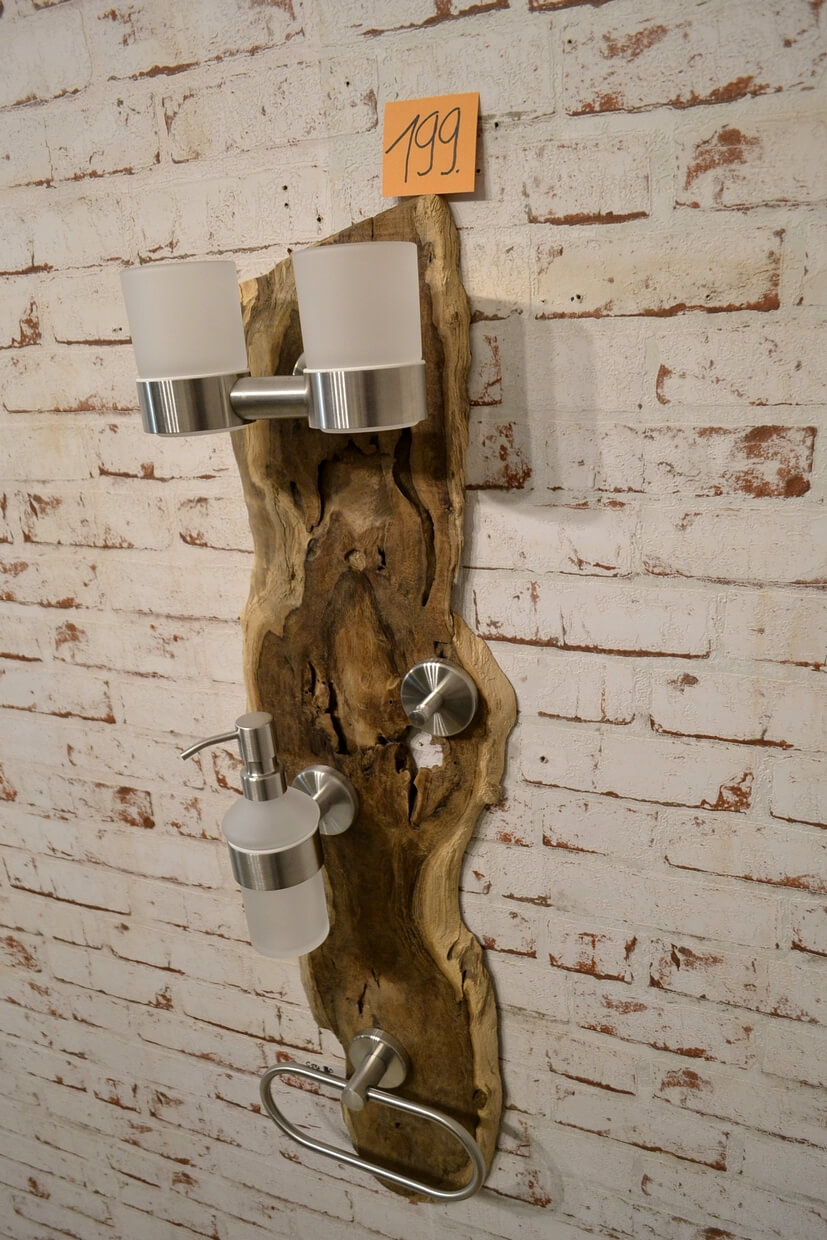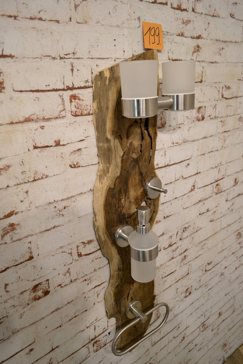 Das Holz der Badgarnituren kann Unebenheiten, Einkerbungen, ehemalige Wurmlöcher und Splintholz (Weißholz) aufweisen.
