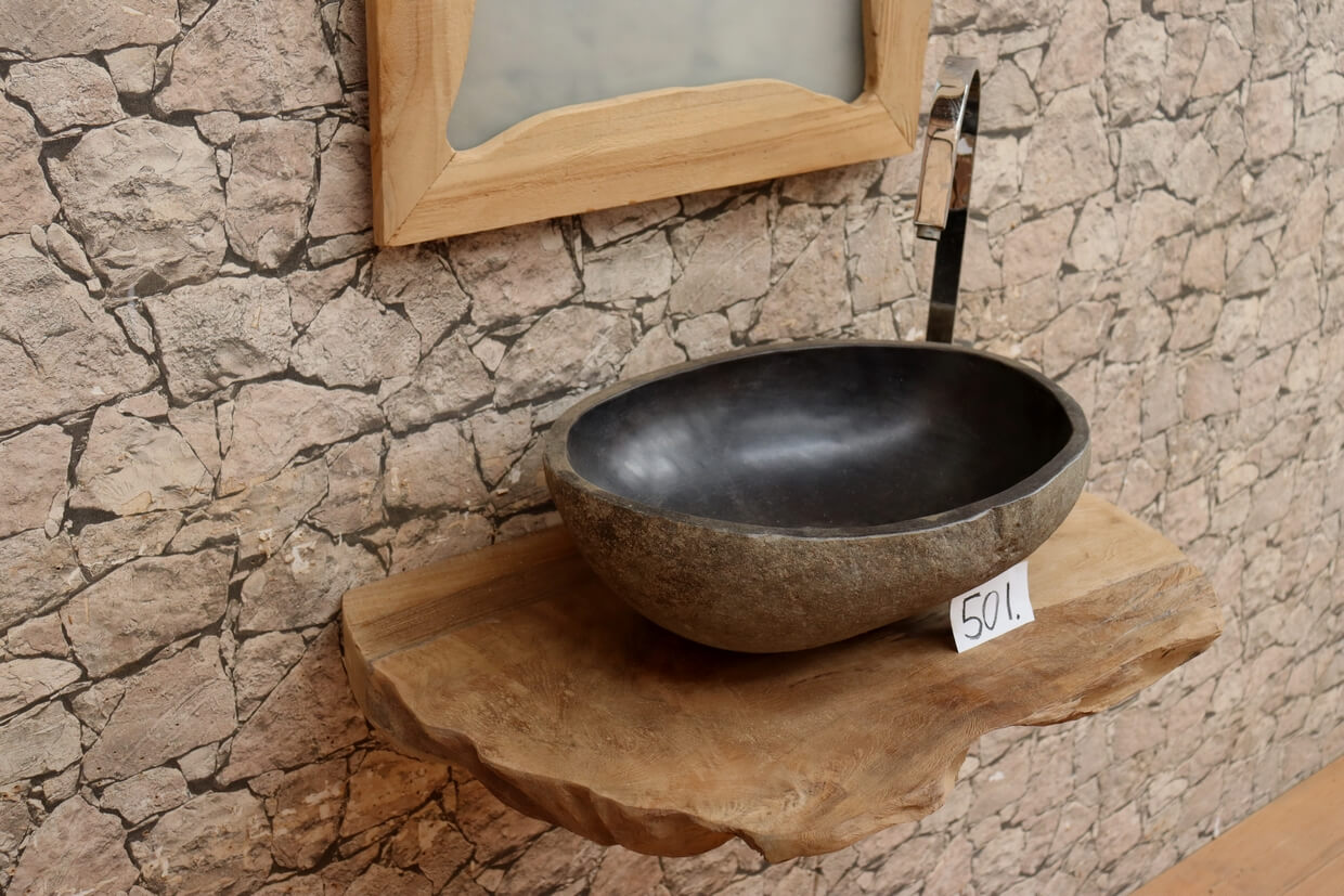 Die Wurzelholz-Waschtischplatten können Unebenheiten, Einkerbungen, ehemalige Wurmlöcher und Splintholz (Weißholz) aufweisen.